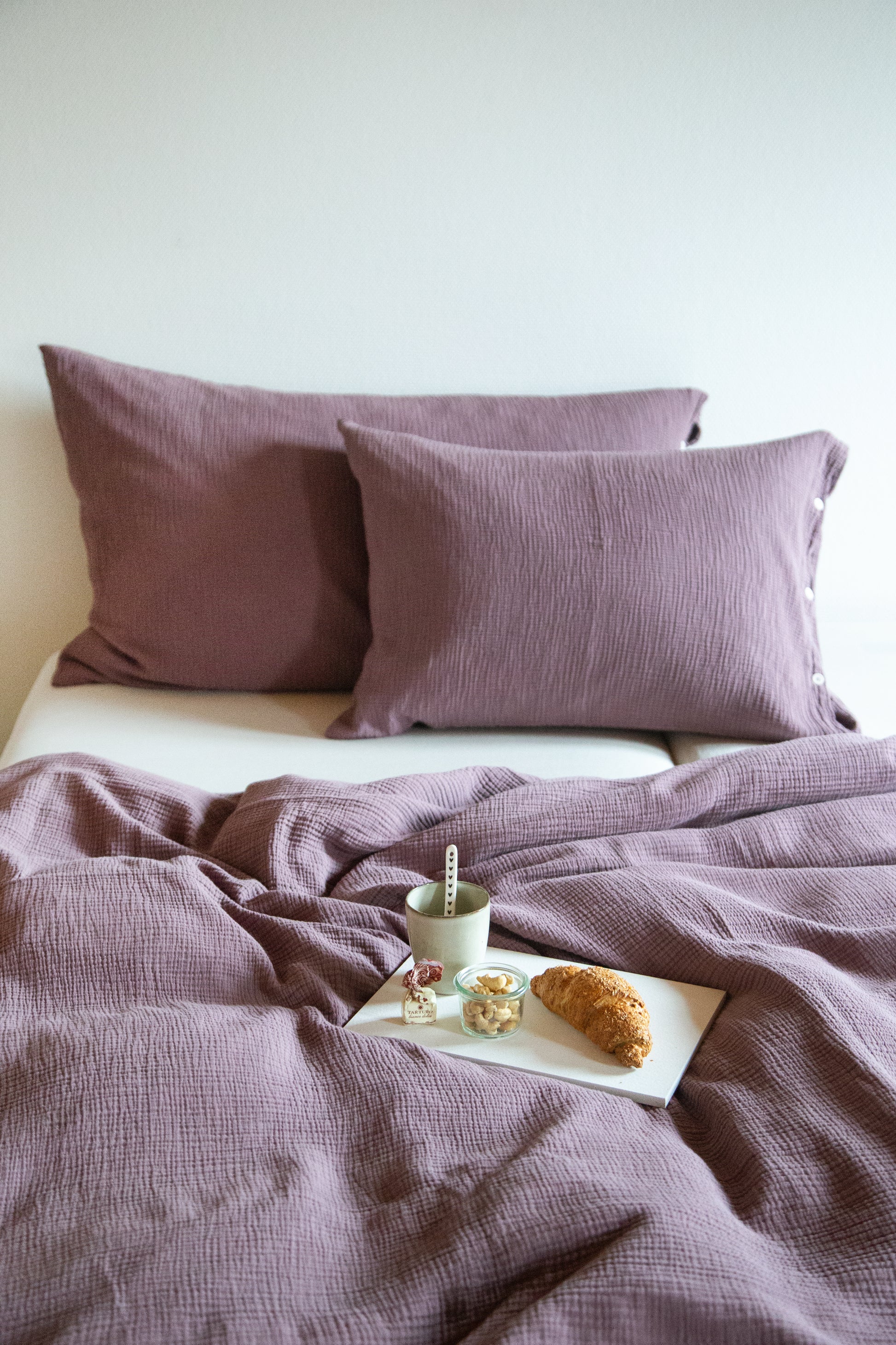 Die Musselin-Bettwäsche gibt es in verschiedenen Farben: weiss, sand, anthrazit, rosa, mint, petrol, farngrün, terracotta und aubergine.